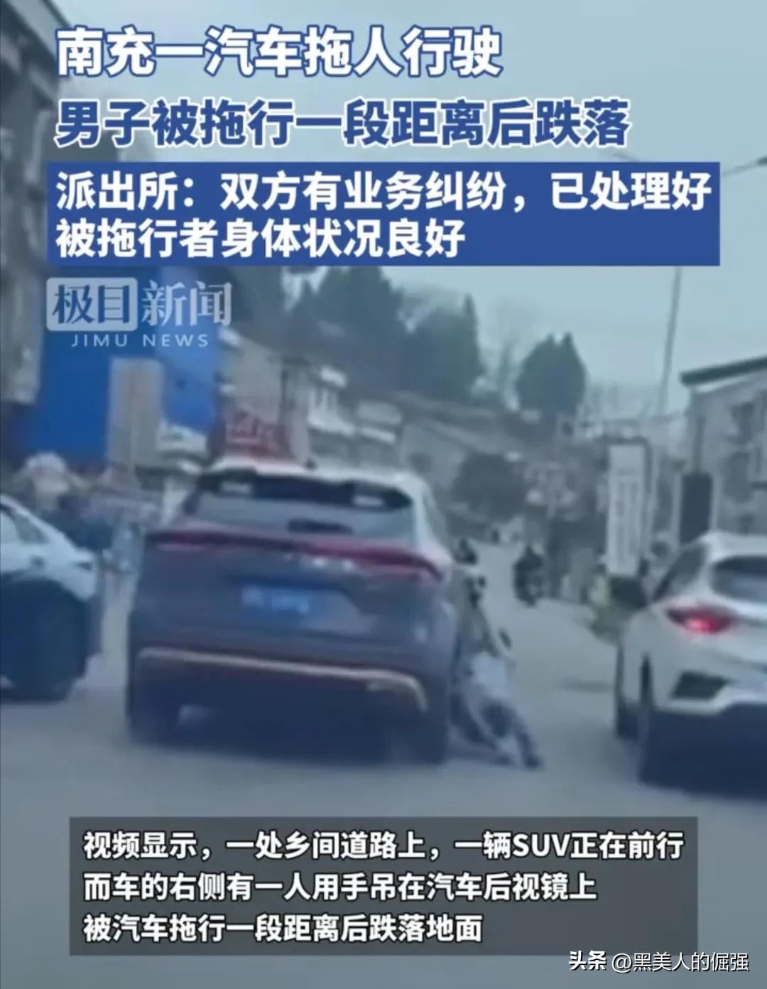 近日,有网友在路上拍到一段汽车当街拖人行驶的视频,视频中,一辆四川南充牌照的SUV汽车,拖着一成年男子行驶了数米远,最后男子体力不支摔落在地。