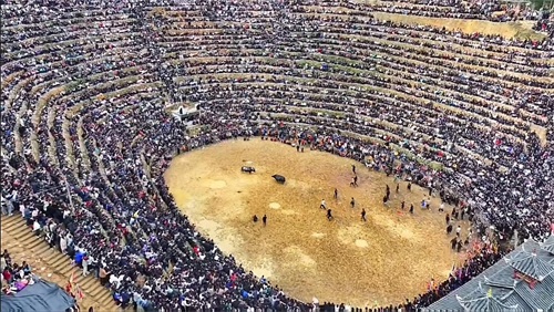 斗牛流程分三步。第一步:斗牛前,各村提前推举代表人分别对牛进行身高、长度、年龄、体重、角长度等检查,然后公告于众,相中的各方可以进行商量,征得各族同意后即可签约,到时可开战。第二步:斗牛时,人们的激情,人们的呐喊,人们的观赏值得大家好奇。第三步:斗牛后,丰厚的特色奖品,不仅仅是百元钞,还有鸭、鸡、大猪蹄、美酒等等礼品。到底是什么能吸引这么多远方而来的客人能千里迢迢来观赏,到底是什么让人们激情的呐喊,到底是什么让人这么沉醉,没错,就是斗牛,这就是斗牛的趣味,观赏性堪比村ba,呐喊声堪比KTV,沉醉性堪比世间美酒。