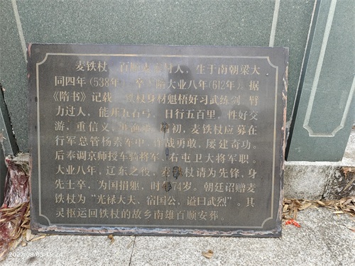 在广东南雄市百顺镇大水迳凤形山上,有一古墓,墓向北,依山而筑,墓坟为半圆形,用青石条和碎石块垒叠砌成,高1.8米、宽1.9米,墓碑刻“隋宿国公麦铁杖之墓”。