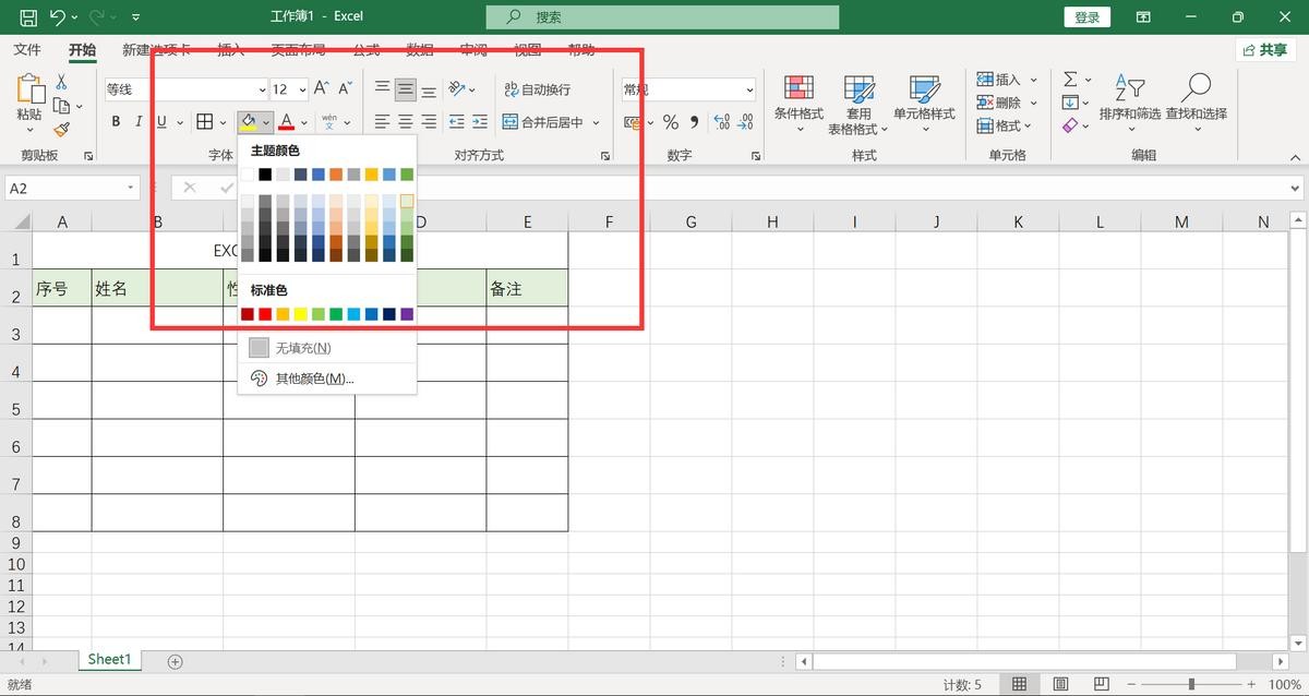 选中单元格,点击菜单栏上“开始-字体-主题颜色”,可以对单元格增加填充色。