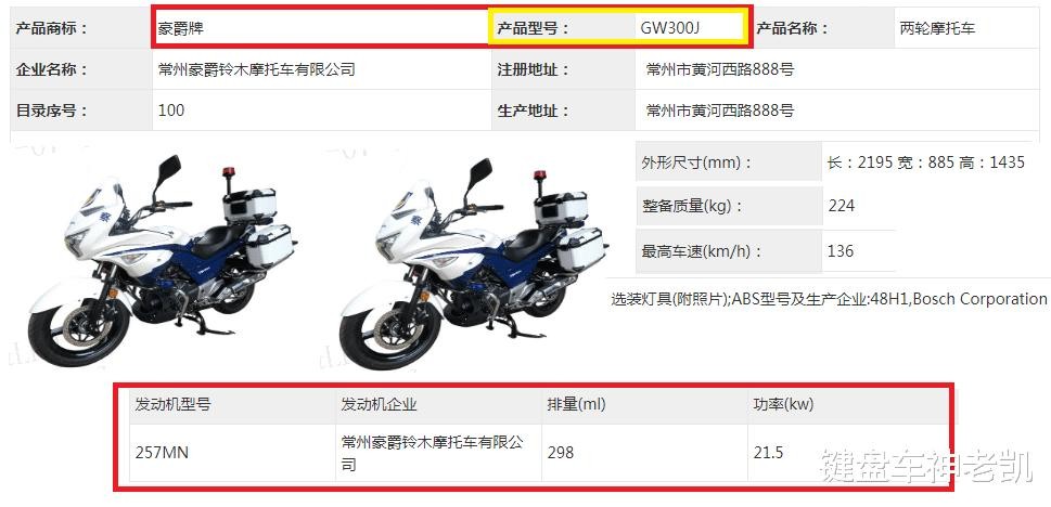车辆型号确实用了GW300J来命名(J代表警用车的意思),并且加装了专业灯具、喇叭和三箱。外观方面与之前猜测得差不多,只是比谍照多了发动机下护板,整车还是使用了老款GW250S版的底子,相比街车款增加了车头整流罩,增高了车把,强化了巡航车的功能。动力部分与DR300相同,实际排量298cc的直列双缸水冷发动机,最大功率21.5kw,其它硬件部分如减震、轮毂、排气都和GW250相同。