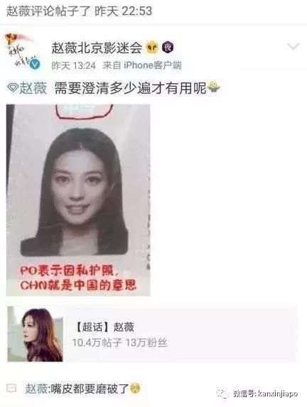 但大家都知道PR跟公民区别还是很大的,赵薇的后援团也晒出过其护照,证明国籍仍然是中国国籍。赵薇也在下面留言,表示:“嘴皮都要磨破了。”广大网友却对此仍然表示质疑。