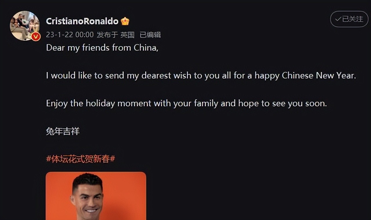 比如,今年国际球星C罗在社交媒体上面写下了,祝贺所有人中国新年快乐以及“Happy Chinese New Year”,