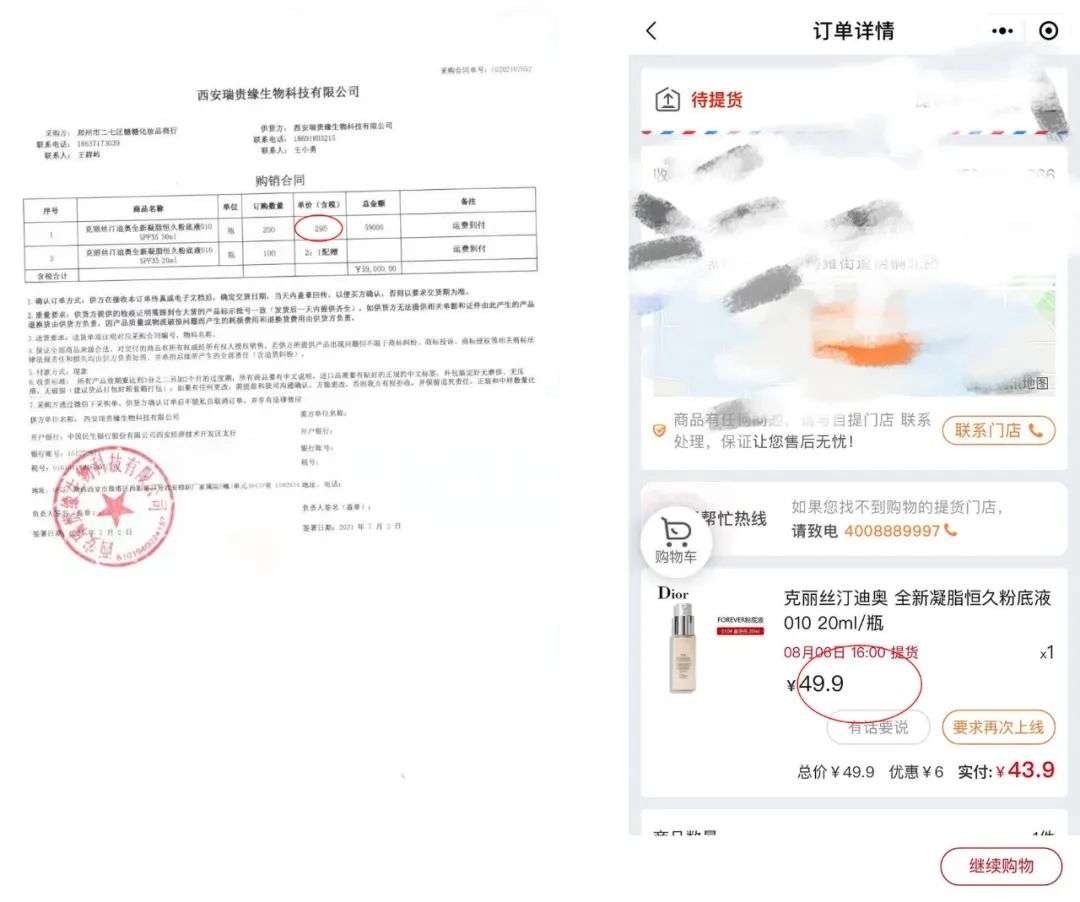 3、对接人提供的产品购销合同中,采购方糖糖化妆品商行的采购单价为295元,但小白的买入价为49.9元(带上优惠券成交价43.9元),采购商的购入价和商品实际售价存在较大差异;