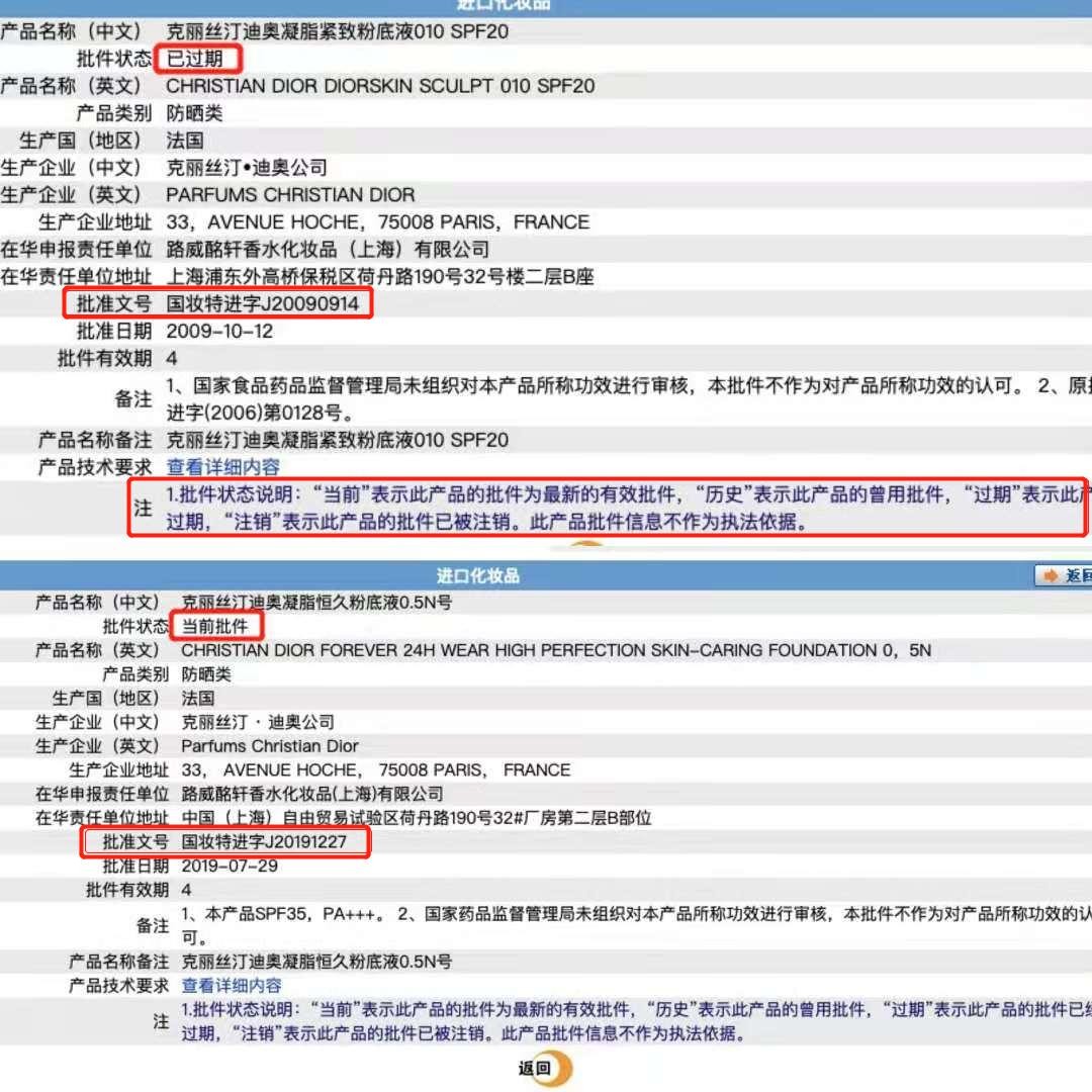 在国家药品监督管理局数据查询页面中,基本上可以溯源和核实所有获得了卫生批准文号的商品。智商税研究中心在进口化妆品类目中输入了该产品批号“J20090914”,结果显示,该批号所对应的产品名称为“克丽丝汀迪奥凝脂紧致粉底液010 SPF20”,而非小白手里的“克丽丝汀迪奥全新凝脂恒久粉底液010 SPF35”,且该产品批件有效期是4年,该批件状态显示为“已过期”。