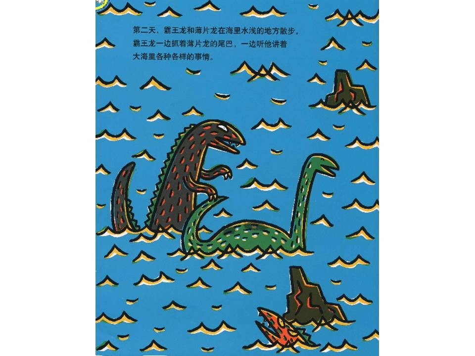 第二天,霸王龙和薄片龙在海里水浅的地方散步。霸王龙一边抓着薄片龙的尾巴,一边听他讲着大海里各种各样的事情。