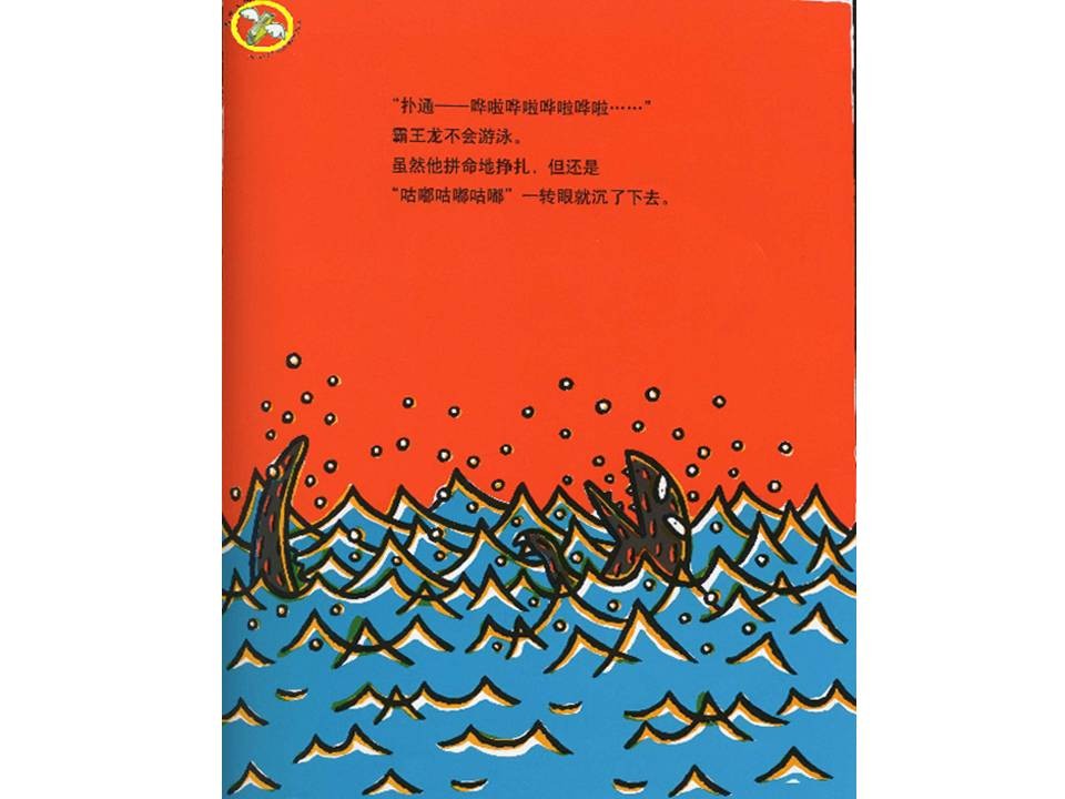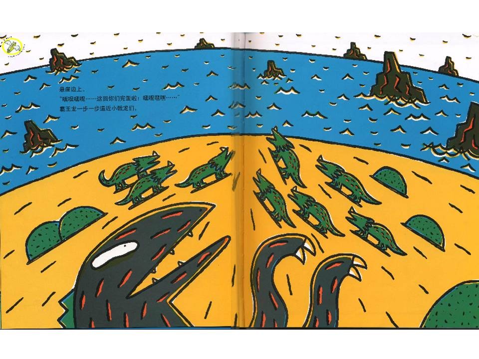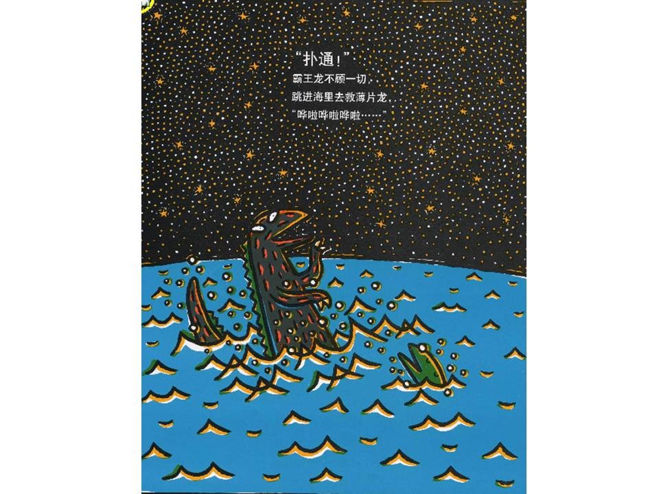 小朋友你知道吗?其实故事中的霸王龙被薄片龙救了两次呢。第一次,他被薄片龙从海里救上了岸;而第二次,他被薄片龙的善良打动,变成了一个温和、体贴的恐龙,他摘红果子时遇到小戟龙们不但没有去追赶,反而安慰他们不要害怕,甚至在看到薄片龙遇险后,没有想过自己不会游泳,奋不顾身地跳进海里去救他的好朋友,曾经那个“粗暴的、霸道的、狡猾的、任性的”霸王龙甚至说“怎么会有这么坏的家伙!”,这不就是曾经的自己吗?!是谁让他有了这么大的改变呢?对,是那个将他救起、帮他舔舐伤口还送给他海贝吃的薄片龙。