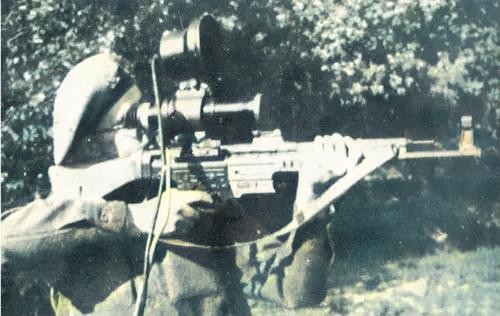 英军军官试射装备红外夜视仪的STG44突击步枪