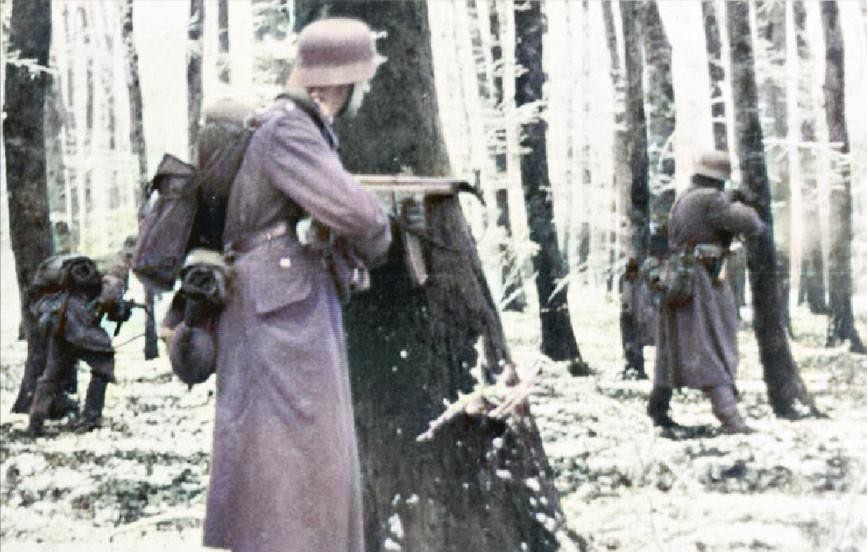 手持STG44突击步枪的德军士兵正在林中摸索前进,这种交战距离有限的场地很适合STG44发挥其火力优势
