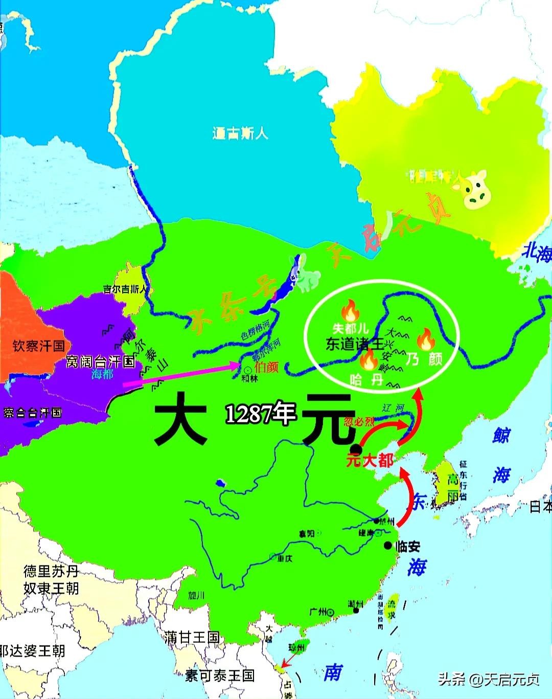 就在忽必烈大军与海都在西线进行对峙之时,海都又组织了新的反忽必烈联盟,成员里面包括成吉思汗兄弟们的后裔——东道诸王,包括乃颜、失都儿、哈丹等。1287年,以乃颜为首的东道诸王叛乱。