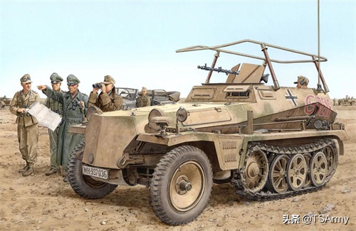 Sd.kfz250是第一代具有装甲防护的半履带车,在1940年开始装备德军,也作为一种侦察单位,250系列最大的优点就是有较大的空间,除了驾驶员和机枪手外,还能额外乘坐4名步兵,采用半履带驱动,越野通过性也更强。该型号正常的情况下武器只有一挺MG34通用机枪,但在后期为了能满足作战需求,还曾安装过双联高射炮和反坦克炮等武器。