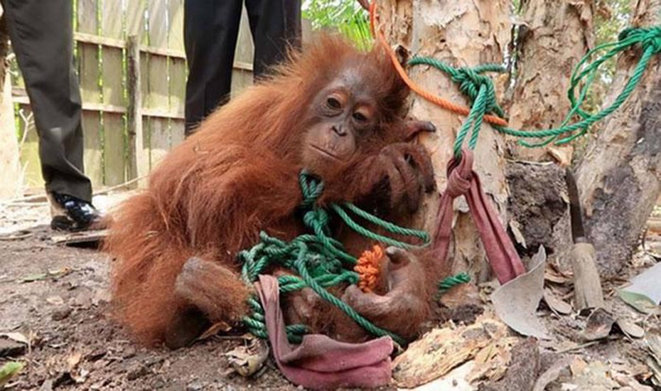 在印尼发现的幼年红毛猩猩,被捆起来等待出售