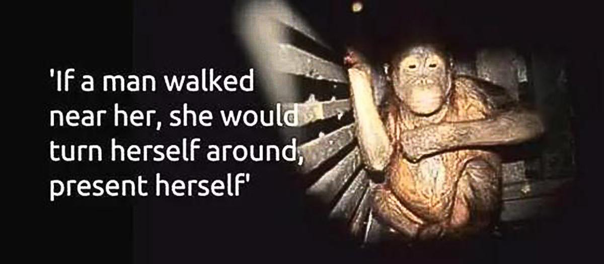 后来参与解救波妮的工作人员说,当他们终于看见波妮的时候,只要男性靠近她,这只未成年的红毛猩猩就会转身弯腰,翘起臀部静静等待着。