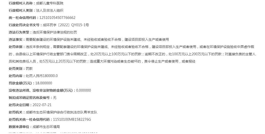 大名鼎鼎的成都儿童专科医院,违反环境保护法,遭罚180000元