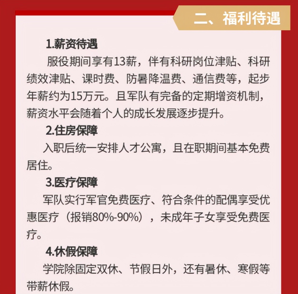 拿国防科技大学举例,部队给到国防科技大学的参军福利有:带军衔执教,也就是当大学老师的同时也有军衔傍身。还可以拿到年薪15万起步,并且是按13个月来算。各种五险一金、公积金、养老保险等不用多说,特别注意的是还有课时费补贴、科研补助甚至家人的补助都非常到位!而且还安排了人才引进公寓来解决年轻人的住房问题,军队科教工作比起普通高校教师来说,有过之而无不及。