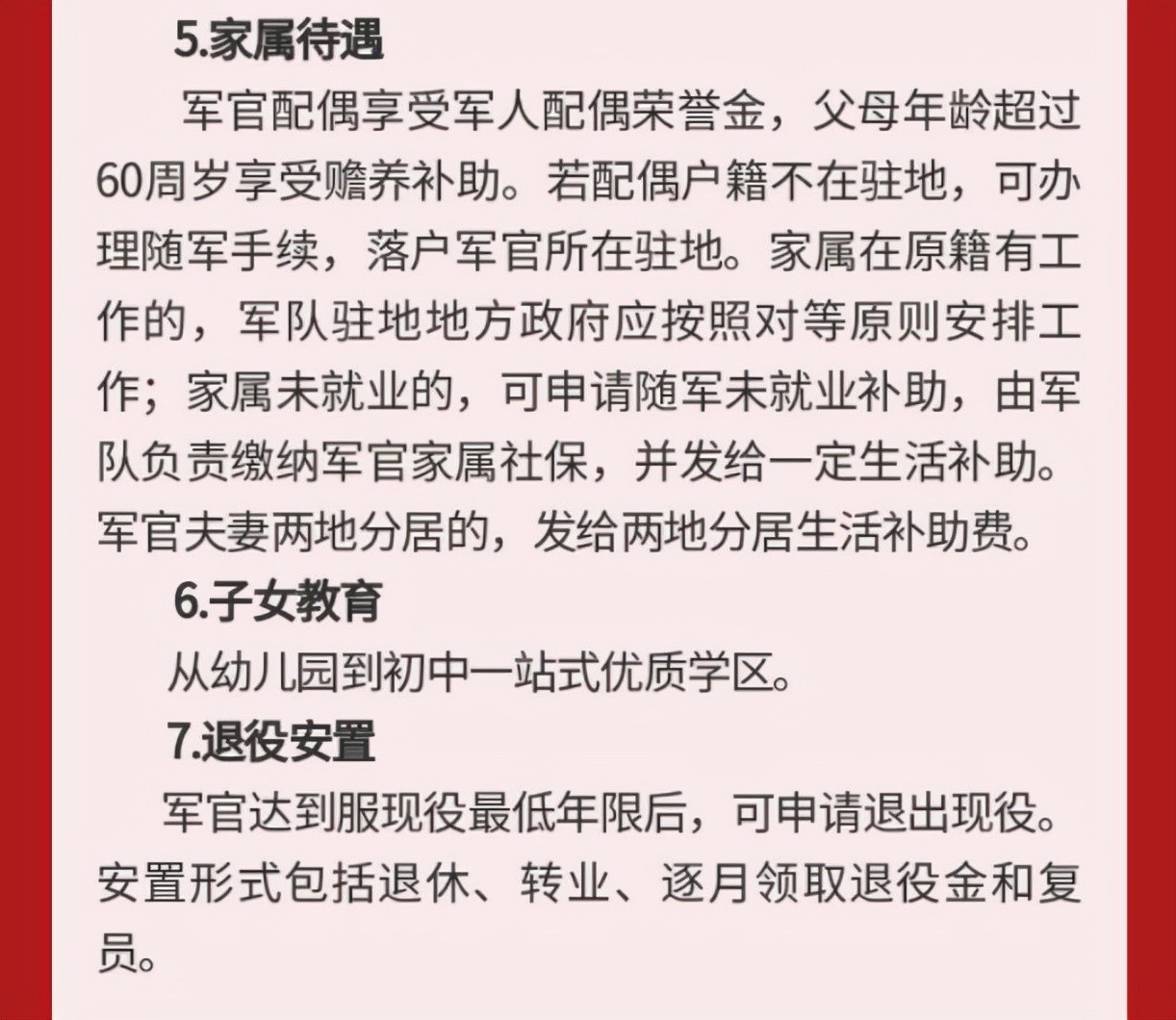 大家可以注意到其中的一个亮点就是:家属待遇——除自身各种医疗费之外,父母60周岁后有国家发放的赡养金,医疗方面配偶享有特殊身份优惠政策,子女均为免费。若家属在家待业还可享有随军分配工作,并且社保一系列均由国家资助!简直就是衣食住行全包了!