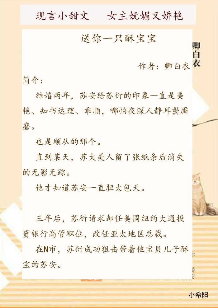 简要概括:这是本婚后宠文,女主前期脱离男主,性子也不如表面那么乖顺,男主后成功化身霸道总裁,追到自己的爱妻,还获得一个自己的宝贝儿子,宝贝儿子要,自己的心肝宝贝我也要。刚开始谁对谁生了情,后来日久生情,一点点地把你划进我的心里,成为我独宠的宝贝,把你使劲宠、使劲宠,再也不想逃离我的身边。