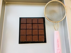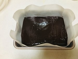 5.将搅拌好的巧克力倒入到模具中,放入冰箱冷藏4小时以上,冷冻2到3小时后取出切块