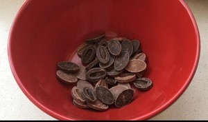 4.将巧克力装入裱花袋中,挤入模具中。放入冰箱冷藏3小时以上,或者冷到1到2个小时脱模,没有模具的话可以用烤盘,放一张油纸在烤盘中