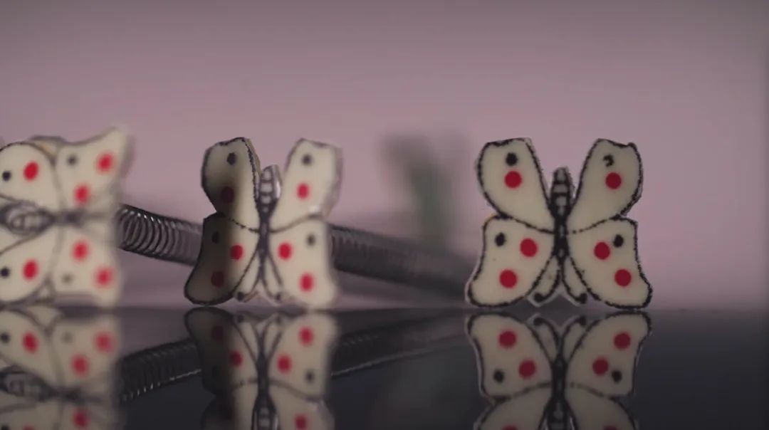 杯体是镂空的,杯底的小蝴蝶是固定在弹簧上面,把弹簧再装在杯底内部,利用光学的原理,在制作过程之中,把它做成焦距成像:杯底的球面是鼓的,盛水则变为平面了。于是,盛水,蝴蝶飞出;空杯,蝴蝶消失。
