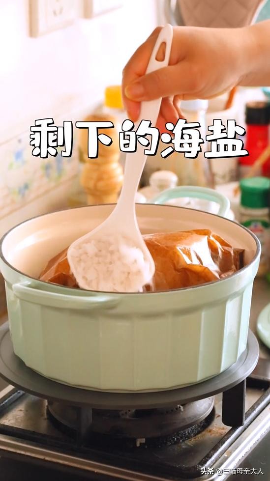 4,先把珐琅锅加热,把炒好的海盐均匀的铺在锅里,大概铺到2指厚的高度,把鸡放进去,把剩下的海盐继续铺到鸡的周围,直到淹没鸡本身,边边角落都记得补充好哦。
