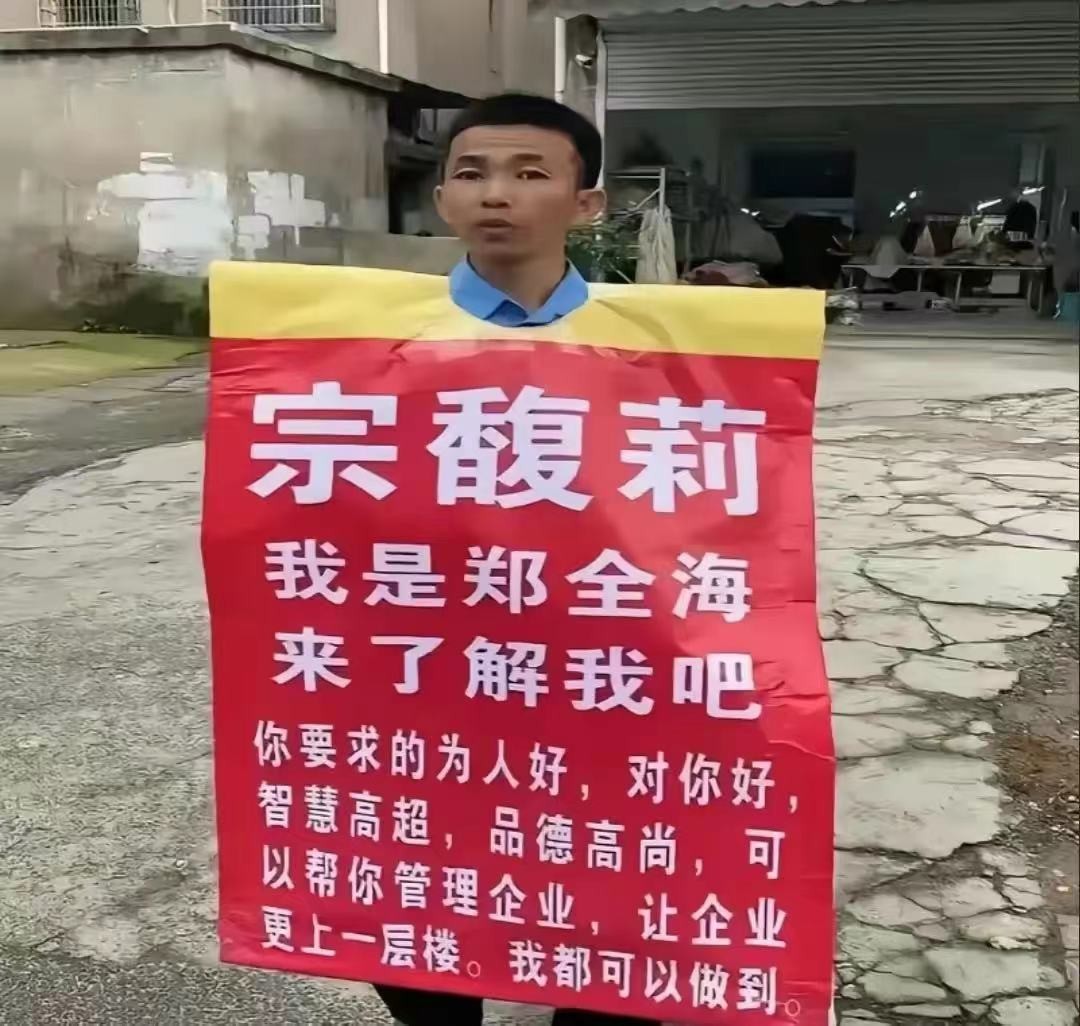 这个郑全海是江西人,之前靠着在街头向宗馥莉求爱走红。那个时候的他头上挂着求爱的牌子,在街头到处宣扬自己喜欢宗馥莉,希望宗馥莉能够给他一个机会。并且他还表示自己品德高尚,智慧高超,可以帮她管理娃哈哈,让娃哈哈更上一层楼。