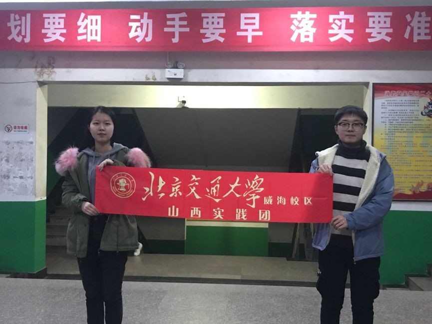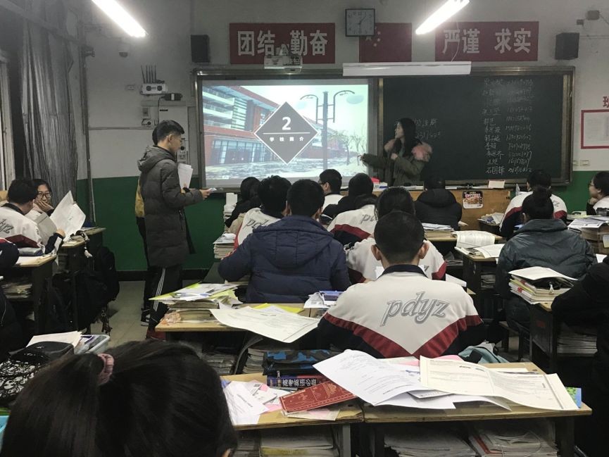 2020年1月18日,北京校区的三位同学和威海校区的孙琭来到了平定县第一中学,即将进行宣讲的班级外已经有很多不同高校的宣讲人正在等候。张贴完海报后,几位宣讲人准备好即将分发的物资,等待上台宣讲。