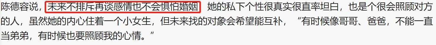 2019年8月,陈德容和丈夫结束八年婚姻,签字离婚。离婚后的陈德容并没有放弃对爱情和婚姻的向往,不过她自己在接受采访时表示"绝不再交圈内人"。