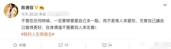 在今年6月份,当杨丽萍因为没有结婚生子被嘲讽是失败的之后,陈德容也是公开发声支持杨丽萍,她表示人自身的价值应该由自己来定义。