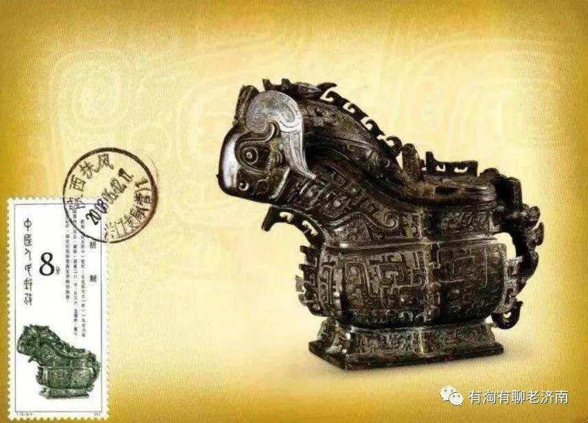 这件青铜器上过邮票,很多集邮的朋友会很面熟。觥(gong),是一种酒器,今天我们形容喝酒碰杯时,依然会用觥筹交错这个成语。