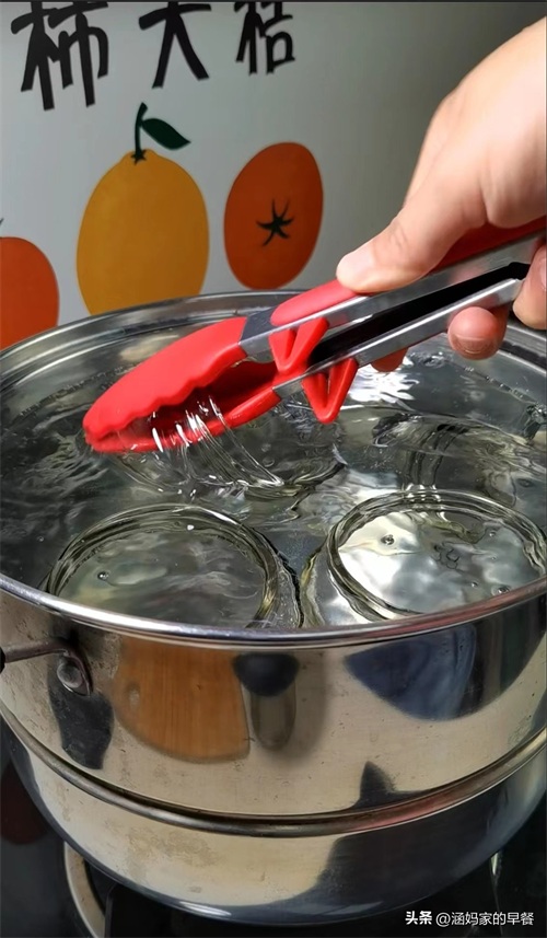 先把耐高温玻璃瓶清洗干净,接着放凉水锅中,水开煮1分钟进行消毒,瓶盖也烫一下。然后倒扣控水。