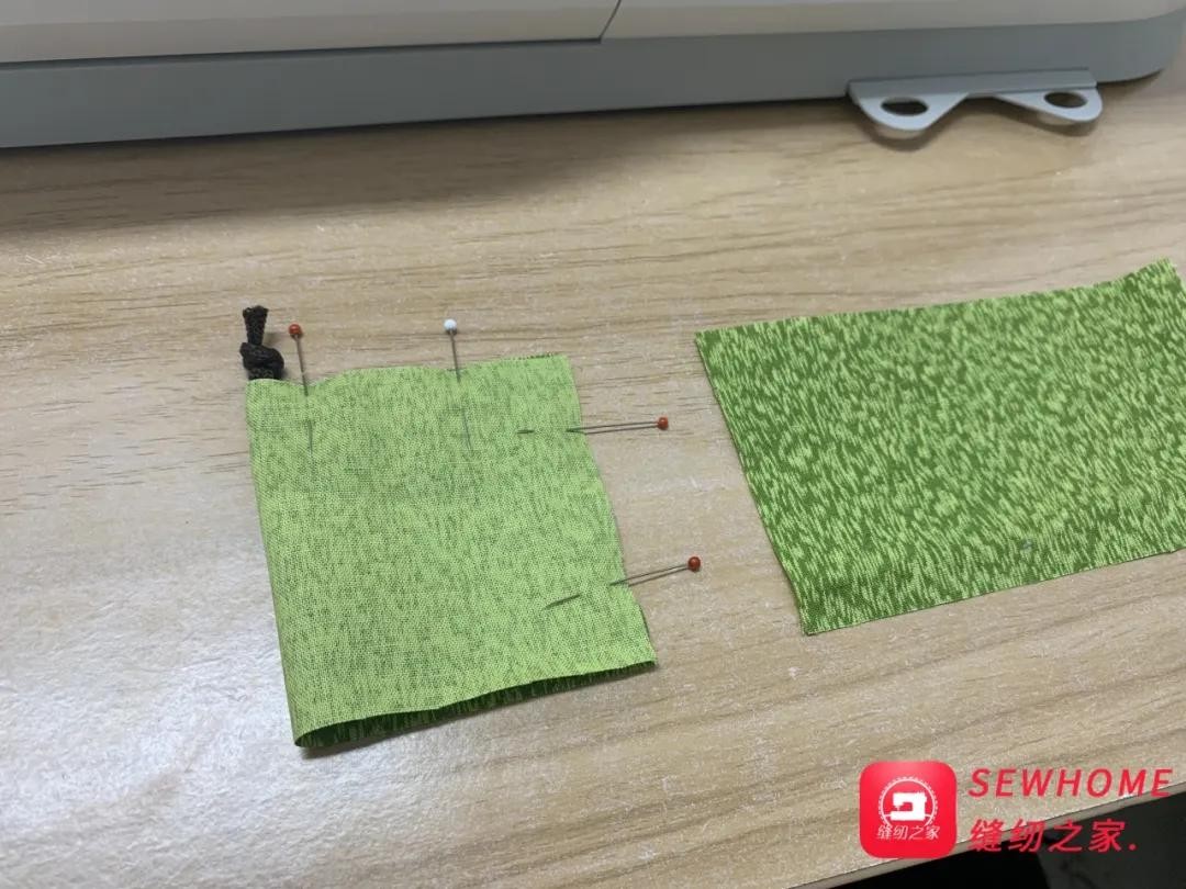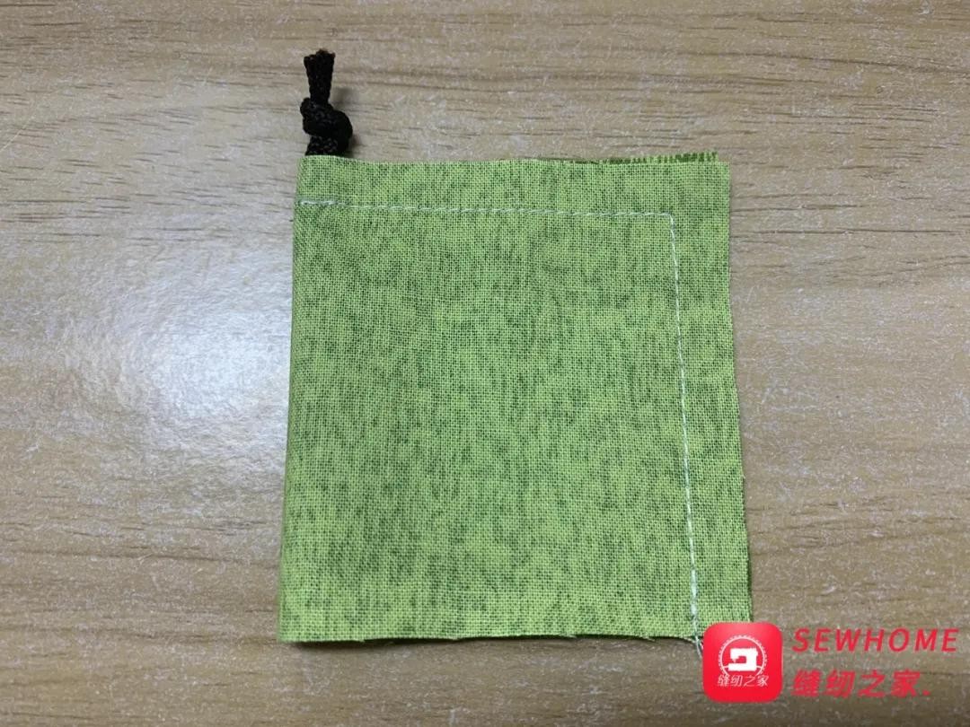 先将绳子打结在一起,面料正面相对对折,将绳子夹到对折处,缝纫一个直角。