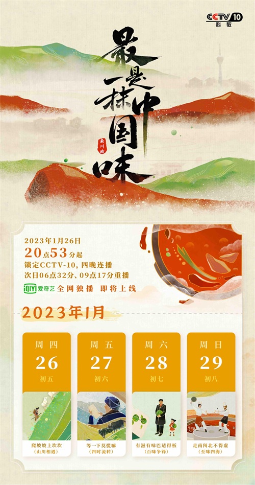 央视全新美食纪录片系列《最是一抹中国味》将于今日,大年初五晚 8点53分 CCTV-10 科教频道首播,后续将在央视其他频道及爱奇艺网络独播推荐上线。本系列创新式的引用四川方言作为分集片名《爬坡坡上坎坎》《等一下莫慌嘛》《有滋有味巴适得板》《走南闯北不得虚》,开创性的结合地方方言沉浸式带入观影,更能让全国观众深入了解属于川渝地区独有的美食文化故事。