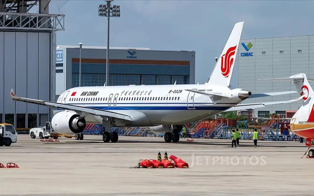 C919交付再次提速,继中国南方航空公司涂装的C919亮相之后,中国国际航空公司涂装的首架C919也正式亮相,机身临时编号B-002M,即将进行出厂试飞。