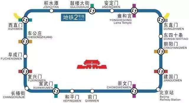 九个内城城墙大概是在明太祖在位的1370-1419年建造,内城周长约24里,一共有九个城门,老北京话说的“四九城”,就是内城东西南北的四面城墙和它的九个城门。看一下地铁2号线,这大致就是四九城的范围了。下面再简单说一下这九个城门当年的作用。