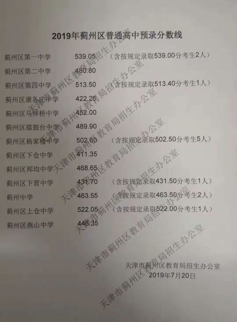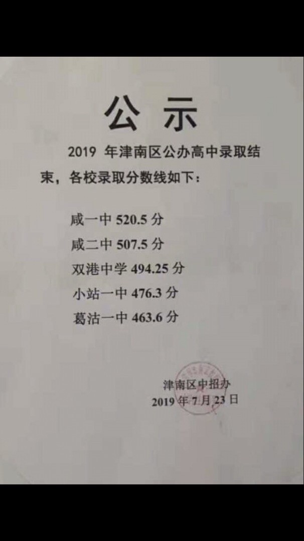 [中招报考] 2019年天津中考普高录取分数线汇总