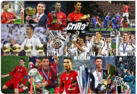 C罗:5个欧冠冠军(包括欧冠三连冠)+英超大满贯+西甲大满贯+国家队2座冠军(欧洲杯冠军和欧国联冠军)+5个金球奖。