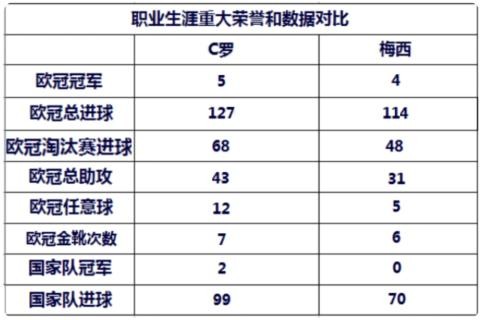 所以综上所述,职业生涯荣誉综合评分,C罗依然压过梅西一头。