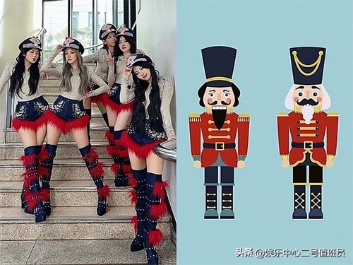最让人惊讶的还是她们在打歌舞台上的服装,那一身香槟色的亮片上衣,下半身蓝色短裤与靴子拼接红色毛绒,简直就是胡桃钳士兵和舞龙舞狮表演服的完美结合!