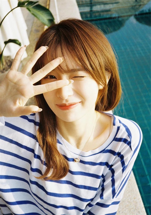 自上而下地俯拍,可以搭配上张手的姿势,面部的表情再丰富一些,比如做一些鬼脸。睁眼闭眼的表情·,更显活泼可爱,还能一手作为前景,增强照片的层次感,更好看。