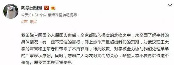 两天后,陶崇园姐姐陶萍(化名)发长微博控诉,其弟弟陶崇园是因为长期受到导师王攀的压迫,最终不堪压力跳楼自杀。该微博所出示的证据称,陶崇园在武汉理工大学读书期间,被导师王攀要求每晚8点左右去家中,帮忙买饭洗衣,让陶崇园称呼自己为“爸爸”,还要喊“爸爸我永远爱你”。除此之外,王攀对于陶崇园的就业与深造都进行了干涉和阻挠。