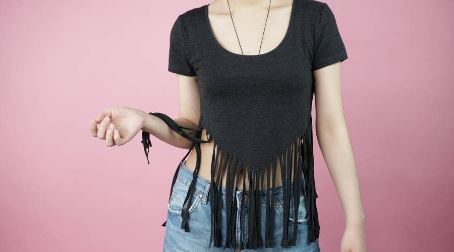 按照画出的线将衣服下摆剪成均匀的布条