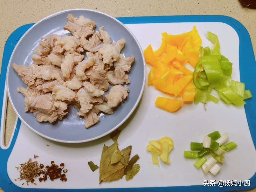 准备的材料如下:焯好水的猪脆骨,黄辣椒青辣椒切块,小葱切段,姜片,香叶,桂皮,花椒,孜然各少许。