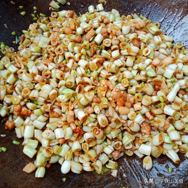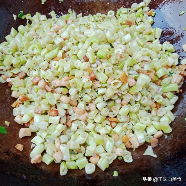 ㈢:锅内加入油烧热,放入五花肉丁,小火煸炒出油,接着放入小米辣,葱花,接着炒出香味,放入豆角大火煸炒!