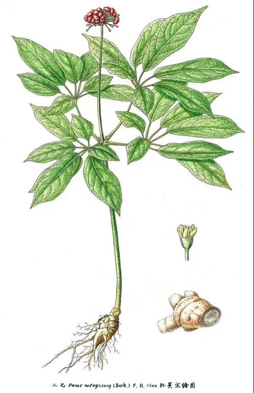 三七作为一味著名的伤科要药,最早出现于明代嘉靖至万历年间,具体记录书籍多有争议。明万历年(1576年)的《医门秘旨》载“三七草”曰“其本出广西,七叶三枝,故此为名。”明朝著名药物学家李时珍在其《本草纲目》记录“三七”为南方军队的金创要药。《增订伪药条辨》《药物出产辨》中记载三七广西镇安府和广西田州为地道,今即广西那坡和百色等地,所以三七又名田七。清道光(1821-1850)年之后,三七的野生资源逐渐匮乏,由于药用需求的扩大,广西西南部与云南东南部相毗邻的地区陆续开始发展种植,现代云南文山州和红河州已成为三七药材的主产地,以云南文山为道地,行销全国。目前三七药材均为栽培品,野生居群未见明确的记录和报道,已被IUCN评估为野外灭绝(EW)。