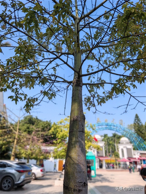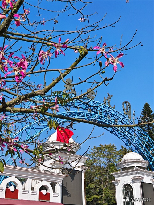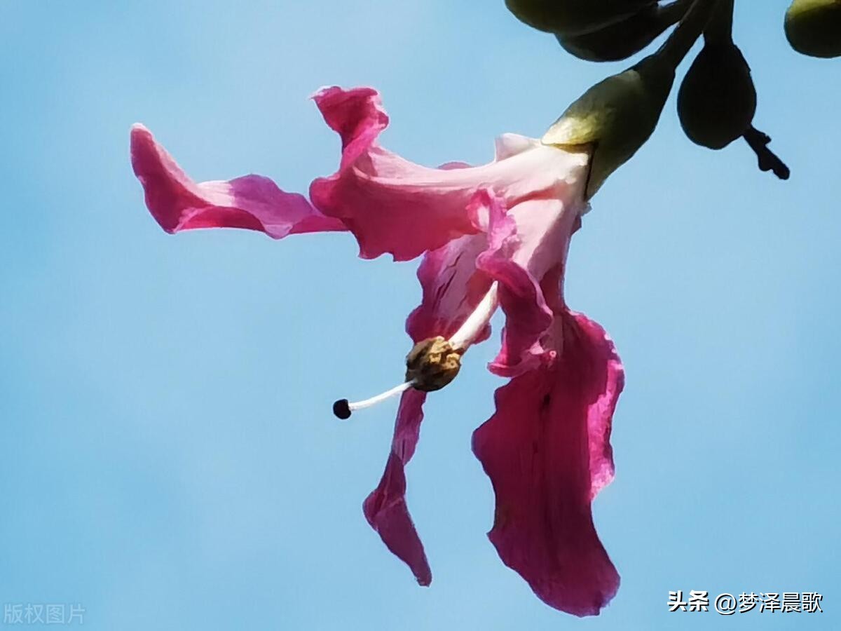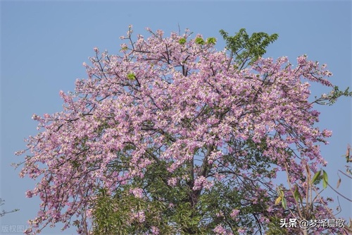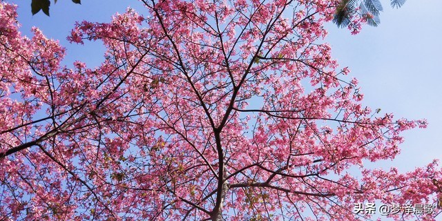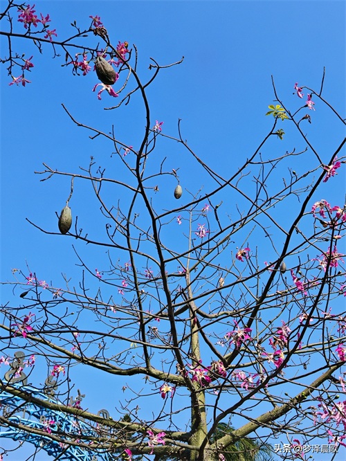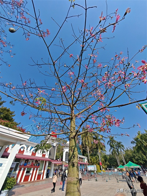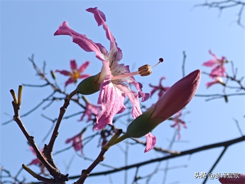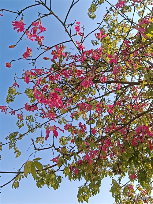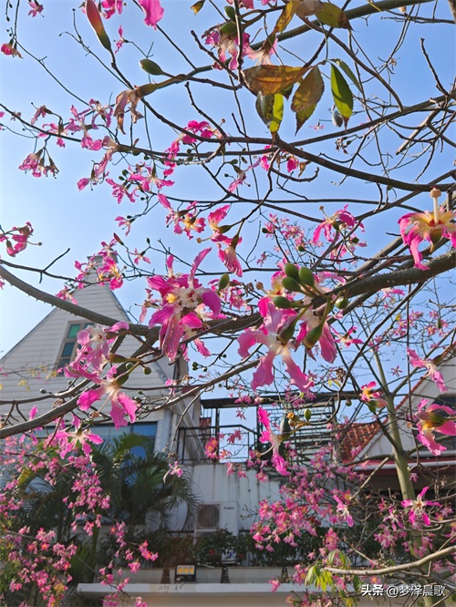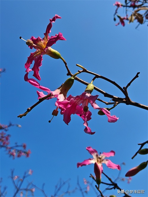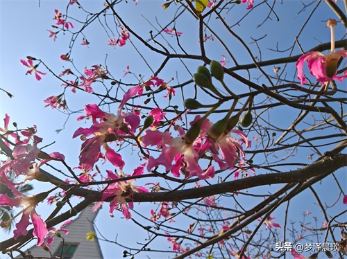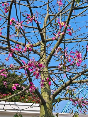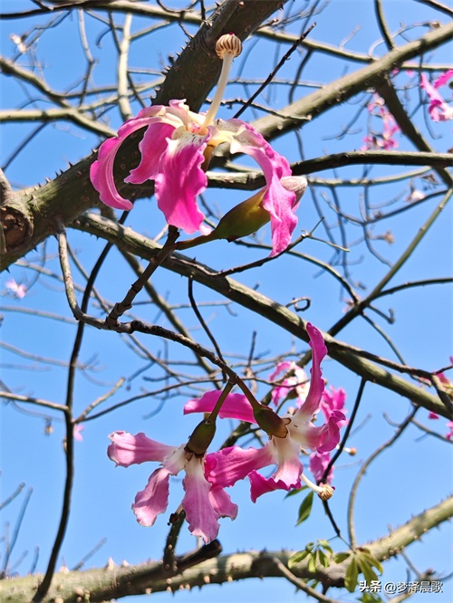 在蓝天的映衬下,异木棉树上挂满了一簇簇盛开的花朵,它们大而娇艳、浪漫非凡。在广州,适宜的气候让它的花期变得更长,有时候也会偷偷赶早,有时又姗姗来迟。赶早也罢,来迟也好,异木棉花开总是那样令人惊喜陶醉。