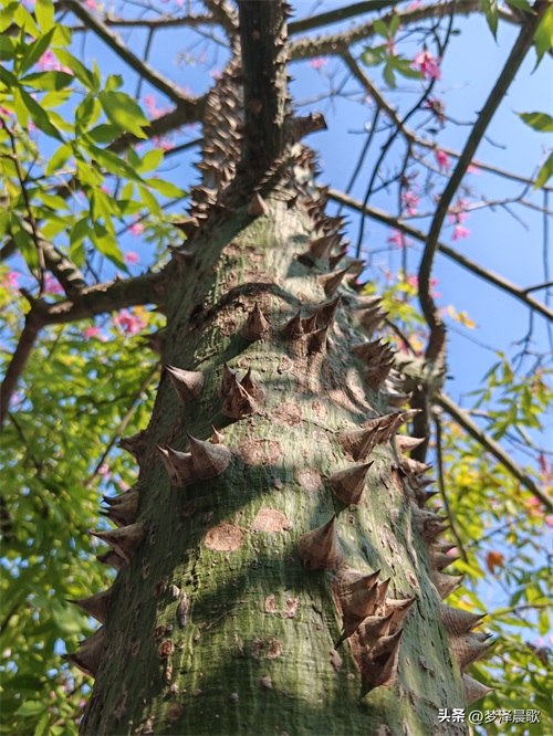 美丽异木棉,别名美人树、美丽木棉、丝光棉等,为锦葵科吉贝属的落叶乔木 。树冠伞形,树干下部膨大,幼树树皮浓绿色,密生圆锥状皮刺、侧枝放射状水平伸展或斜向伸展,花单生于叶腋,花冠淡紫红色,中心白色,花瓣舌状或长卵形;蒴果椭圆形,内含绵毛 。花期9月至翌年1月,果期3-6月 。