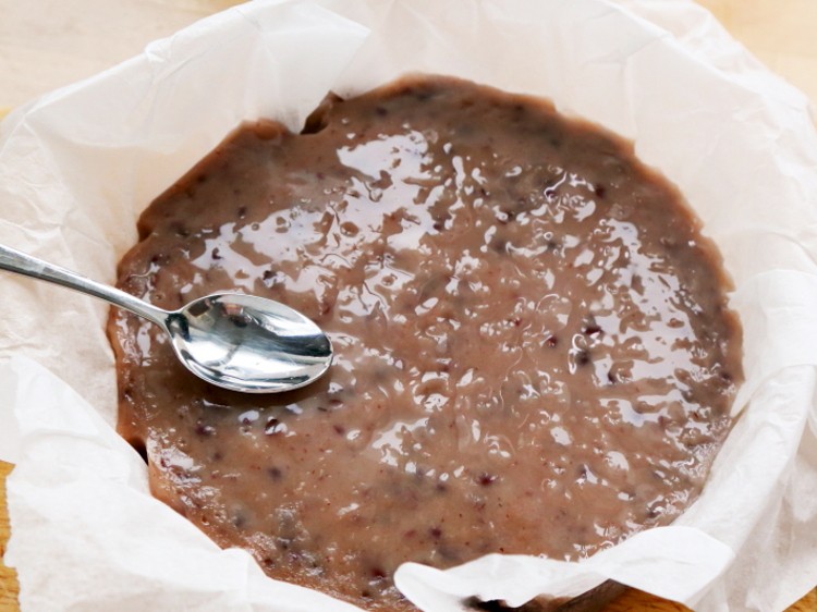 3.然后加入蜜红豆约200克拌匀,拌好的面糊浓度应该是落下的面糊波纹不会马上消失。