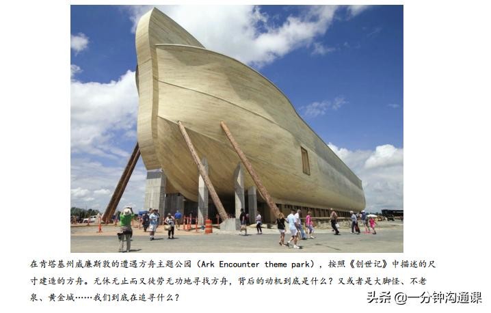 于是,人们在肯塔基州建立了一所诺亚方舟的主题公园,并按照等比例建做了一艘诺亚方舟,来巩固诺亚方舟这个神话。