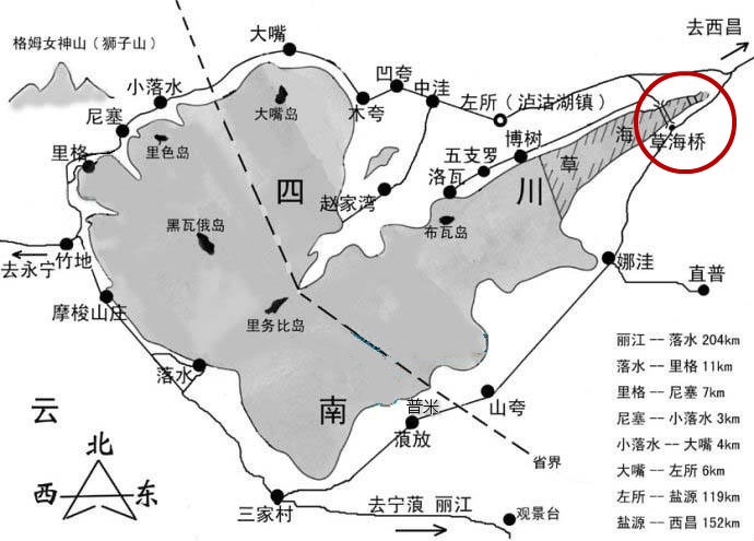 放一张走婚桥的位置图(图中圆圈里的草海桥),如图所见走婚桥连接了草海的两岸。传说很久以前,一对相爱的摩梭男女分别住在草海两岸,因为传统的走婚制,两人不能住在一起,晚上男子划船到对岸与自己心爱的女子约会。天亮前又划船返回。时间长了两人便萌生了在草海上搭建一座桥的想法,后来便在草海上修建一座简易木桥,后人称之为“走婚桥”